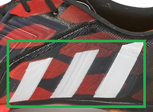 Dribble Zone: è quella collocata nella parte centrale/anteriore della scarpa (sul lato esterno), ed è composta da 5 bande a zig-zag che si estendono verticalmente (ovvero in direzione della zona di allacciatura). Questa zona, grazie alla sua superficie ruvida, contribuisce a mantenere un miglior grip col pallone in occasione di un dribbling verso l’esterno.