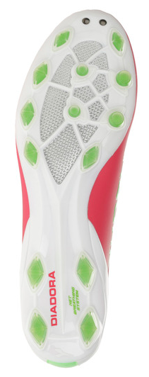 Suola. Per la realizzazione della suola delle DD-NA GLX 14, la Diadora si è affidata al Pebax, un materiale che, rispetto al TPU tradizionale, è più leggero e flessibile: non a caso, la suola risulta dotata di ottimo grado di flessibilità, sin dal primissimo utilizzo. Per ciò che concerne la configurazione di tacchetti, quella adottata sulle DD-NA GLX 14 rappresenta qualcosa di veramente innovativo, mai vista prima su nessun altra scarpa da calcio: si tratta, infatti, di una configurazione a base di tacchetti romboidali con l’aggiunta di 4 tacchetti circolari nella parte anteriore. In campo, questa configurazione permette di ottenere risultati molto simili a quelli delle Adidas F50 adiZero: si registra, infatti, un ottimo mix di trazione e manovrabilità, e soprattutto, un efficientissima distribuzione della pressione esercitata contro i tacchetti, che rendono la scarpa estremamente comoda anche dopo un utilizzo prolungato. Sempre per ciò che concerne la suola, non si può non segnalare la presenza della ormai nota Net Breathing System, già adottata, con successo, su modelli precedenti come le DD-Eleven e le DD-Evoluzione: sostanzialmente, la parte anteriore della suola include al suo interno una rete in fibra sintetica + una speciale membrana traspirante ed impermeabile. Questo accorgimento tecnologico permette alla scarpa di espellere il calore in eccesso che si accumula all’interno, e di mantenere il piede sempre fresco ed asciutto. Questo processo di traspirazione, ovviamente, è reso possibile anche grazie alla presenza della speciale soletta interna, la quale, nella parte anteriore, risulta traforata in piu' punti, per permettere, appunto, l’espulsione del calore in eccesso verso il basso.