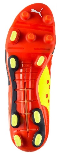 Suola. La suola delle Puma evoPower 1 rappresenta, assieme alla tomaia, l’aspetto più innovativo dello scarpino. Innanzitutto, è realizzata in Pebax, un materiale che, rispetto al TPU tradizionale, è dotato di maggior leggerezza e flessibilità poiché ha una densità minore. Ma la cosa veramente particolare è la presenza della cosiddetta G.S.F. (Gradual Stability Frame), una sorta di spina dorsale inserita nella suola che permette alla scarpa di piegarsi con molta più facilità, sia verso l'alto che verso il basso. Prendendo in mano la scarpa e piegandola, si noterà, effettivamente, come la suola riesca a piegarsi, con molta più facilità del normale, sia verso l’alto che verso il basso. Questa maggior flessibilità della suola è stata voluta perché gli studi condotti da Puma hanno dimostrato che calciare a piedi nudi aiuta a generare maggior potenza di tiro, in quanto la naturale flessibilità del piede non viene limitata e si ha il massimo trasferimento di potenza sulla palla. E ciò che fa la suola delle Puma evoPower 1 è proprio questo: garantire al piede un livello di flessibilità che sia quanto più simile possibile a quella di cui gode quando si calcia a piedi nudi. Provando la scarpa in campo e calciando ripetutamente in porta, tuttavia, non si è in grado di stabilire se la potenza sia effettivamente maggiore o no, ma di certo si ha più fluidità nei movimenti e si riesce a calciare di potenza con molta più facilità. Si tratta, quindi, di una tecnologia che di certo non guasta. Per ciò che concerne i tacchetti, le Puma evoPower 1 presentano una configurazione mista, con 4 tacchetti lamellari sul retro e 7 sul davanti (di cui 4 circolari e 3 lamellari). Provando le scarpe in campo, tale configurazione risulta abbastanza soddisfacente: nelle accelerazioni frontali, infatti, il grip col terreno è abbastanza buono e nei cambi di direzione a 180 gradi la scarpa mostra un discreto livello di manovrabilità.
