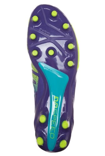Suola. La suola delle Puma evoSpeed 1.3 è, in tutto e per tutto, uguale a quella evoSpeed 1.2, senza modifiche di alcun genere (neanche minime). Dal punto di vista della trazione e della stabilità, quindi, le Puma evoSpeed 1.3 offrono le stesse identiche performance delle evoSpeed 1.2. Come spiegato in occasione della recensione delle Puma evoSpeed 1.2, questa suola è realizzata interamente in TPU ed è dotata di tecnologia Duoflex, che consiste, nella presenza di alcuni "solchi" nella parte anteriore della suola, per migliorarne la flessibilità in tutte le direzioni (ovvero, sia quando si corre in avanti, sia in occasione di un movimento laterale). Ma la vera particolarità di questa suola risiede nella presenza del cosiddetto SpeedTrack, che è una vera e propria “barra” realizzata in Pebax, che si estende dalla zona del tallone, fino alla parte centrale della suola. Lo scopo di tale elemento tecnologico, sostanzialmente, è quello di migliorare il “ritorno elastico della suola” in fase di corsa: in altri termini, la suola, dopo ogni singolo piegamento, grazie allo Speedtrack tende a ritornare alla sua posizione d’origine un po’ più rapidamente di quanto possa fare una normale suola in TPU e ciò aiuta, in qualche misura, a potenziare la spinta contro il terreno e, quindi, a generare maggior velocità (da cui appunto, il nome SpeedTrack). E’ necessario, precisare, comunque, che la presenza dello SpeedTrack rende la parte centrale e posteriore della suola nettamente più rigida di quella di una normale suola in TPU: prima che si riesca ad “assimilare” totalmente la presenza di tale elemento tecnologico e a godere appieno dei suoi benefici, sono necessarie, pertanto, alcune partite e/o sessioni di allenamento. Per cio' che concerne la configurazione dei tacchetti, questa, come già detto sopra, è identica a quella già vista sulle evoSpeed 1.2: abbiamo quindi 4 tacchetti ovali sul retro e 8 circolari sul davanti. Tale configurazione garantisce un mix perfetto di trazione e manovrabilità, proprio per la presenza dei tacchetti circolari, che permettono di far “ruotare” la scarpa nel terreno con grande facilità.