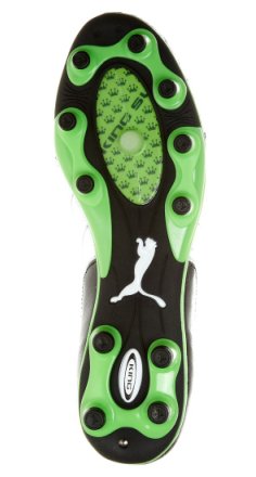 Suola. Da un punto di vista estetico la suola delle Puma King Finale SL è identica a quella del modello originario (le King Finale) ma con uno spessore inferiore. Cio’, ovviamente, comporta una maggior flessibilita’, che è un fattore sicuramente positivo. Ma dall’altro, rende la pianta del piede molto piu’ sensibile alla durezza del terreno. E’ quindi altamente consigliabile utilizzare la versione con suola FG solo sui terreni che possano definirsi realmente FG, cioe’ compatti, evitando invece quelli secchi e duri: in tal caso, infatti, la maggior durezza del terreno comporterebbe una netta percezione della pressione esercitata contro i tacchetti. Questo discorso, ovviamente, vale, in generale, per qualsiasi altra scarpa con suola FG, ma con le Puma King Finale SL è necessario prestare ancor piu’ attenzione. Per cio’ che concerne la configurazione dei tacchetti, questa e’ stata lasciata invariata: si hanno quindi, 4 tacchetti circolari sul retro e 8 sul davanti, sempre circolari. Il livello di trazione che offrono è sicuramente soddisfacente, ma non è di certo eccellente come quello offerto da altre scarpe dotate di tacchetti lamellari. In compenso, pero’, si ha una miglior agilita’ nei rapidi cambi di direzione: i tacchetti circolari, infatti, in occasione della rotazione della scarpa, generano indubbiamente un minor attrito col terreno.