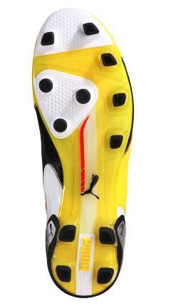 Suola. A differenza dei precedenti modelli della gamma King, per la cui suola Puma ha sempre utilizzato il TPU (poliuretano termoplastico), questo nuovo modello King risulta invece dotato di una suola realizzata in Pebax, che come già detto sopra, è un TPU più leggero ed elastico di quello tradizionale. Di diverso, rispetto ai precedenti modelli, vi è anche la configurazione dei tacchetti, non più circolari, bensì dalle forme miste: piu' esattamente, 9 quadrangolari e 3 circolari, posizionati a triangolo nella parte anteriore della suola. In termini di performance in campo, questa nuova configurazione di tacchetti da' l’impressione di garantire una trazione leggermente migliore. La rimozione dei tacchetti circolari a favore di quelli quadrangolari, tuttavia, fa diminuire, in qualche misura, la manovrabilità della scarpa, ovvero la sua capacità di rotazione nel terreno in occasione dei cambi di direzione. Da questo punto di vista, quindi, la vecchia configurazione di tacchetti delle Puma King, con tacchetti tutti “rigorosamente” circolari, risulta sicuramente più performante.